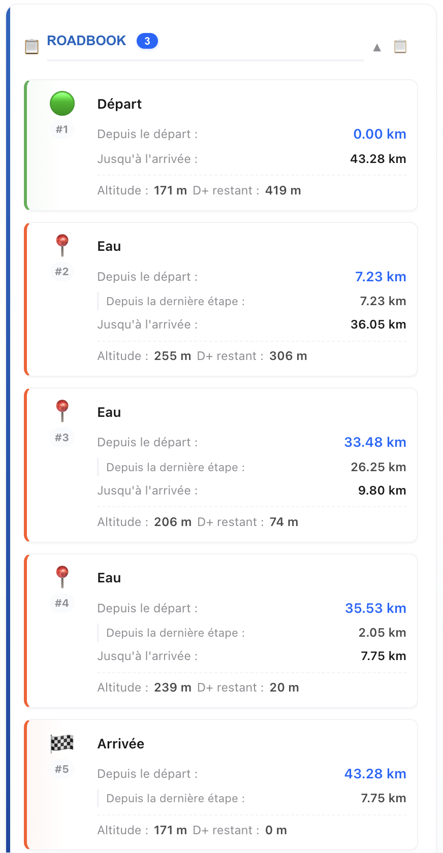 The application automatically enriches the roadbook with cumulative distances, remaining elevation gain and allows you to add custom waypoints. No more juggling between multiple tools: everything is done in a single, intuitive interface optimized for cycling route preparation.