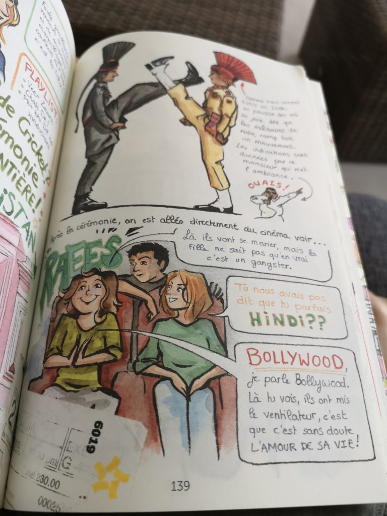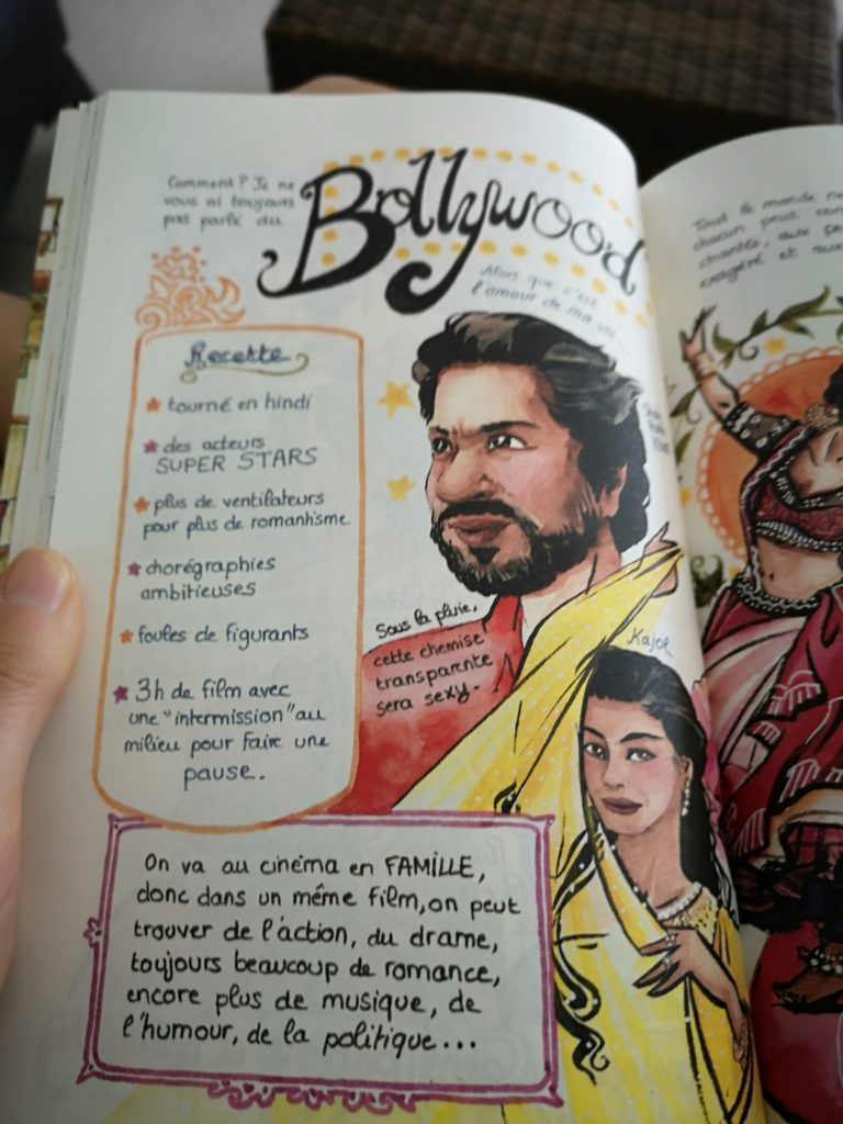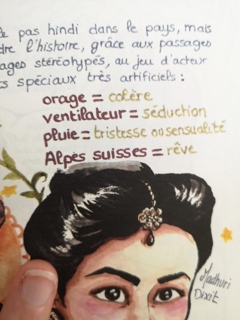 Amour – L’histoire d’amour est un incontournable du Bollywood. Elle permet entre autre la fameuses scènes dansées et chantées. Même si on ne comprend pas les dialogues, il y a des signes qui ne trompent pas comme les cheveux qui se mettent à voler comme si on avait allumé un ventilateur devant le personnage. A ce sujet voici quelques illustrations du livre « C’est décidé, je pars en Inde! » qui aident à décrypter cela.