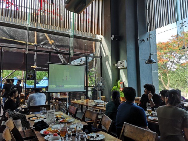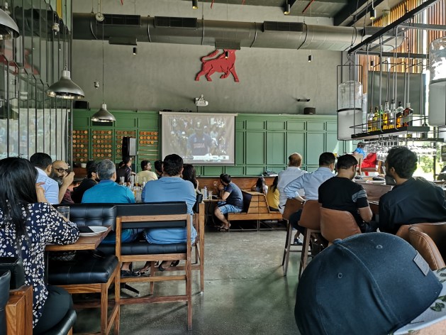 Les batsmen alternent les renvois/frappes de balle entre eux deux, probablement en fonction du niveau de fatigue ou de chance sur lequel ils sont. Un batsman est éliminé si, lorsqu’il renvoie la balle, elle est directement attrapée, saquée, sans rebond, par un joueur adverse. Il sort donc du terrain et est remplacé par un autre joueur de l’équipe. Ainsi, nous avons vu un batsman indien acclamé, sorti après sa deuxième frappe car la balle a été attrapée au vol. Tout le temps où nous étions dans le bar, le batsman Kohli était sur le terrain, il a marqué un grand nombre de points, GO KOHLI!
