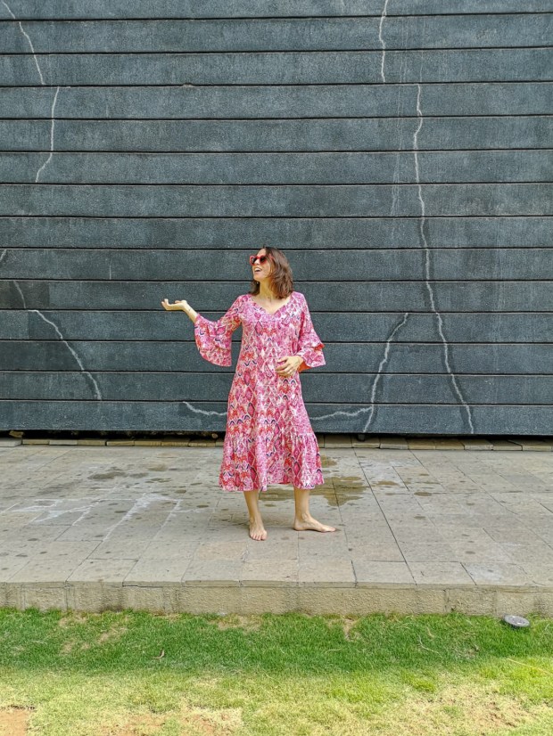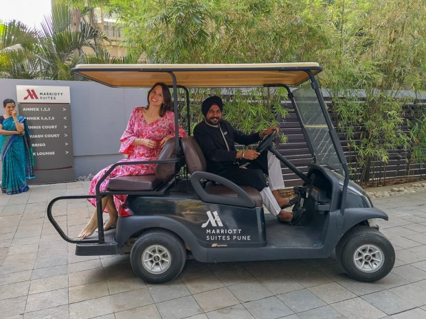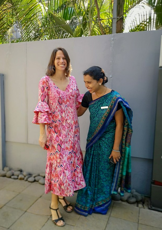 Jeudi dernier, quand son réveil sonne pour aller travailler, je me motive, je me mets en tenue pour assister au cours de yoga. J’y rencontre Estefania, avec qui je prends le petit-déjeuner après notre session de 45 min. Elle est Andorrane, mariée à un Anglais, ils sont à Pune depuis plus d’1 an (je crois), et sont installés à l’hôtel. Elle est fashion designer et exporte ses robes en Espagne, à Ibiza plus précisément si j’ai bien compris.