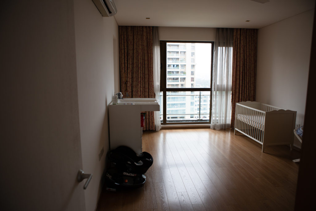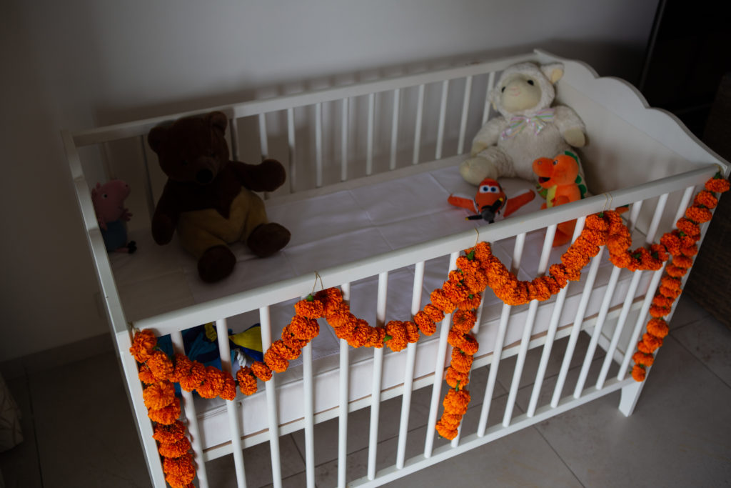 Pour préparer la chambre de bébé, nous avons pu acheter des meubles seconde main à des expatriés (lit à barreaux, chaise haute). Des amies – Mille Mercis – m’ont également prêté ou donné des affaires (vêtements, jouets, systèmes de portage, lit cododo, transat, tapis d’éveil, baignoire…). Le plus difficile à trouver était une table à langer digne de ce nom ; nous avons profité d’un camion affrété par un couple d’amis depuis Ikea Hyderabad pour faire venir une belle table à langer. C’est presque le seul meuble neuf que nous ayons acheté.