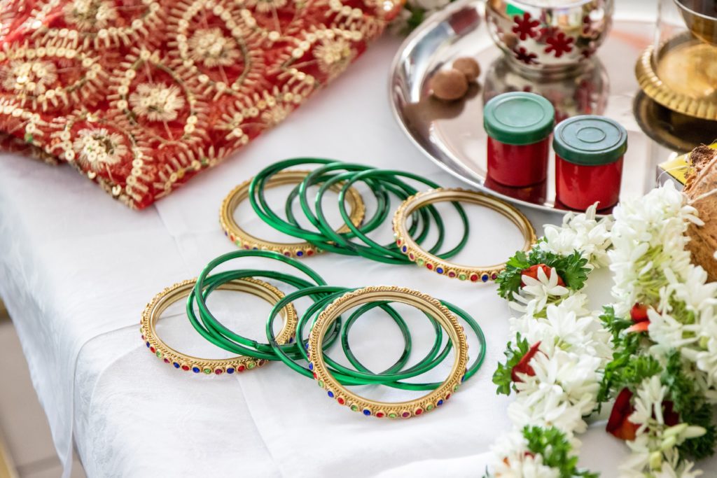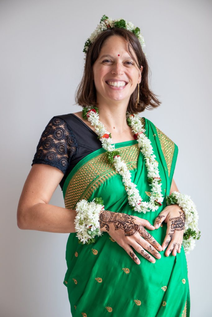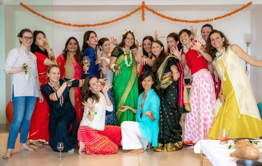 J’ai la chance d’être bien entourée : 2 copines m’ont organisé une baby shower, au début du 9ème mois. J’ai donné la liste des copines à inviter sans enfants ni mari(elles sont toutes venues), la date, le lieu (chez moi), et elles se sont chargées du reste. Le matin de la baby shower, Pauline, notre femme de ménage (appelée « maid » ici), a décoré le salon avec des fleurs fraîches. Et à 14h, les copines sont arrivées, en tenue indienne, avec des vivres. Dessin au henné sur les mains, habillage en sari et bénédiction hindoue, sessions photo j’ai été gâtée ! Le plus dur était de ne pas pouvoir boire de vin blanc avec elles, bien que Dr NM m’autorise 2 verres d’alcool par semaine…